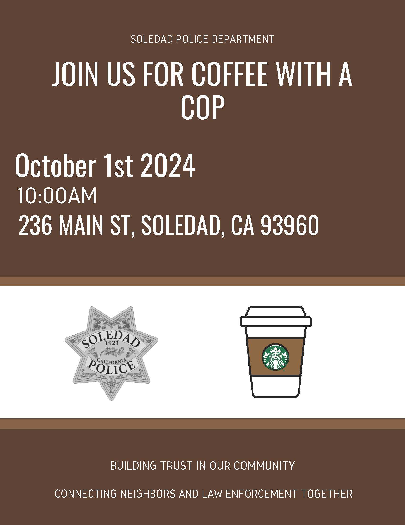Don’t miss this great opportunity to get to know the officers at Soledad Police Department. October 1st at 10 am.