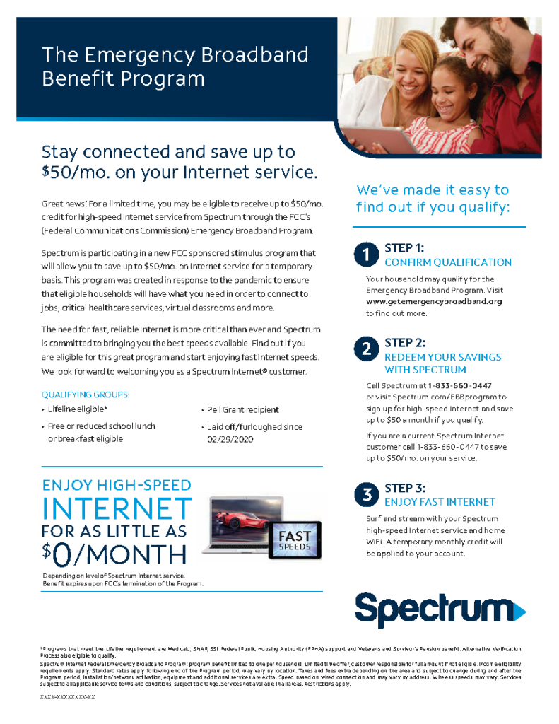 Great news! For a limited time, you may be eligible to receive up to $50/mo. credit for high-speed Internet service from Spectrum through the FCC’s (Federal Communications Commission) Emergency Broadband Program.