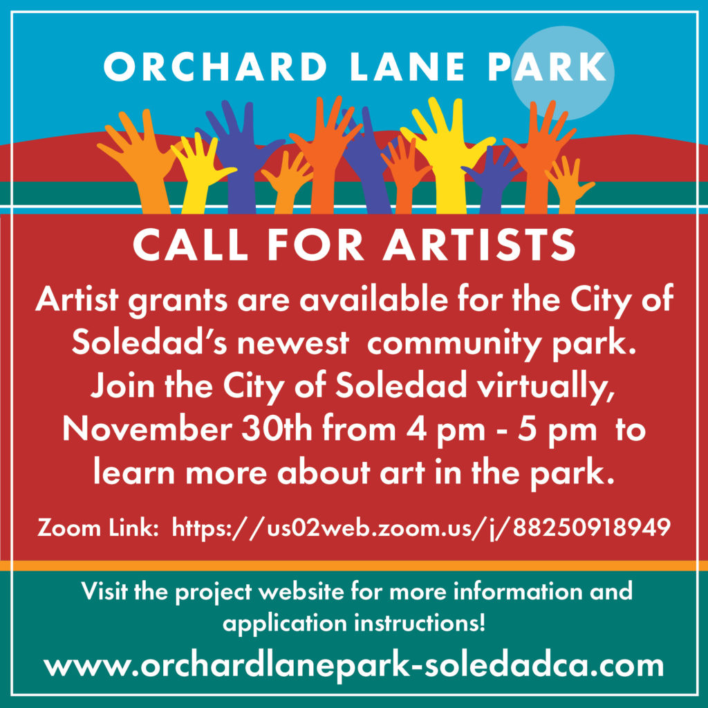 City of Soledad is currently looking for artists to create artwork for the new upcoming Orchard Lane Park. Please join us via Zoom on November 30th from 4pm-5pm to learn more about the art in the park.
