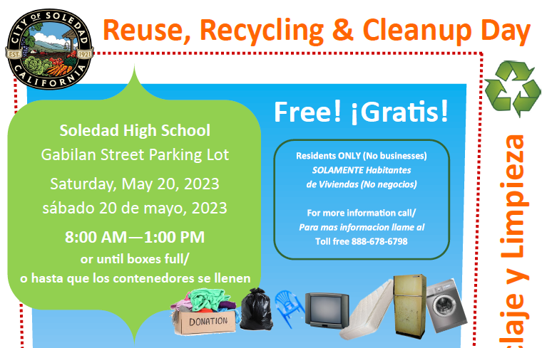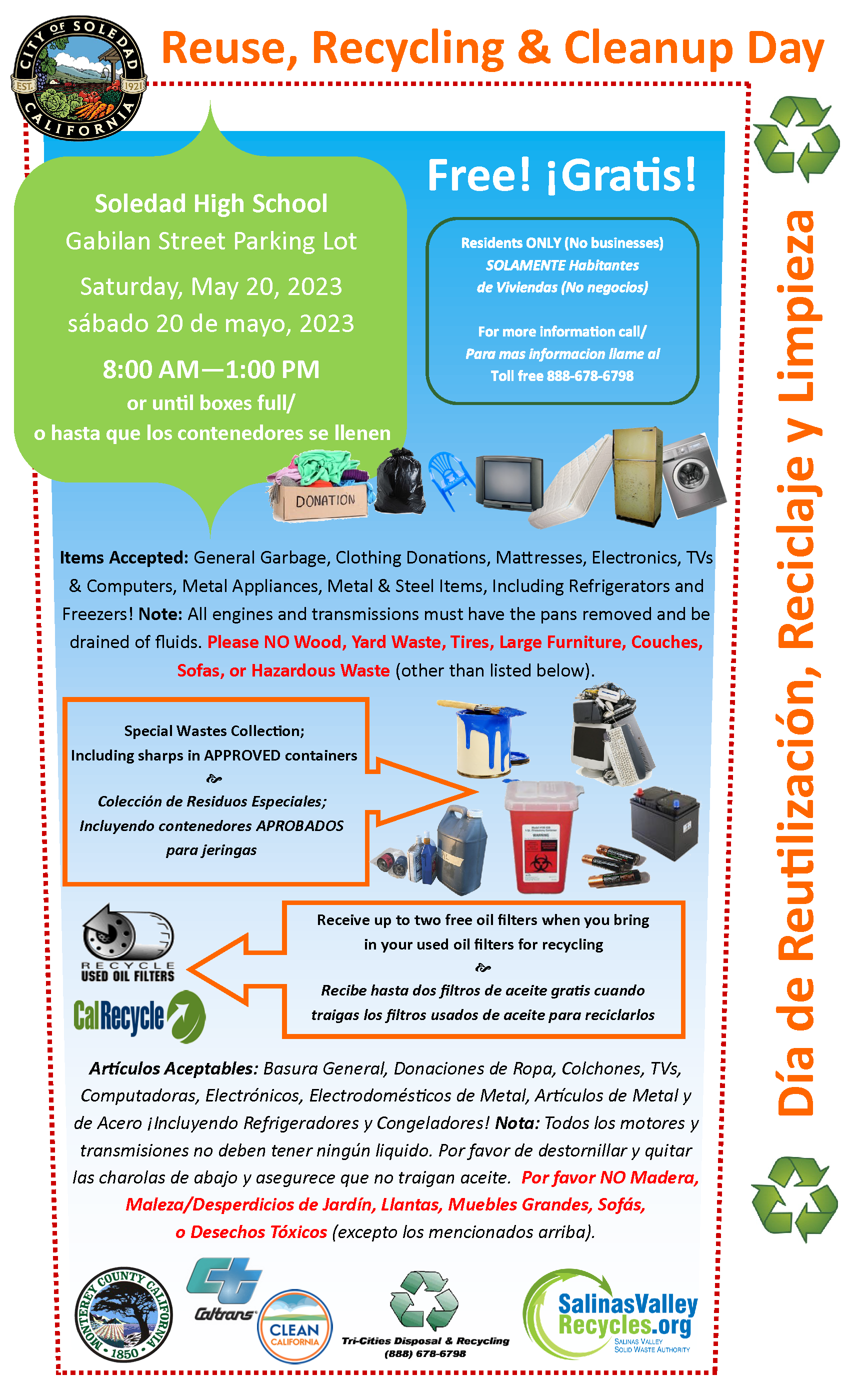 The City of Soledad held its spring Reuse, Recycle & Cleanup Day event on Saturday, May 20, 2023. This special event focuses on facilitating the diversion of recyclable materials, addressing the ongoing issue of illegal dumping in Soledad, and promoting reusing still usable items. The event took place in the Gabilan Drive parking lot in front of Soledad High School.