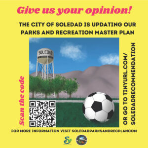 The City’s Parks and Recreation Master Plan Update is a tool that will be used to guide the development, use, and maintenance of parks and recreational spaces across the city. Your participation in the creation of this plan is highly encouraged and will help shape the future of Soledad!