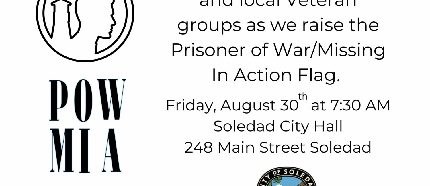 On Friday, August 31st, at 7:30 am, the City of Soledad, along with Veteran groups, will host a ceremony to raise the POW/MIA Flag. The flag will remain flying for the entire month of September.