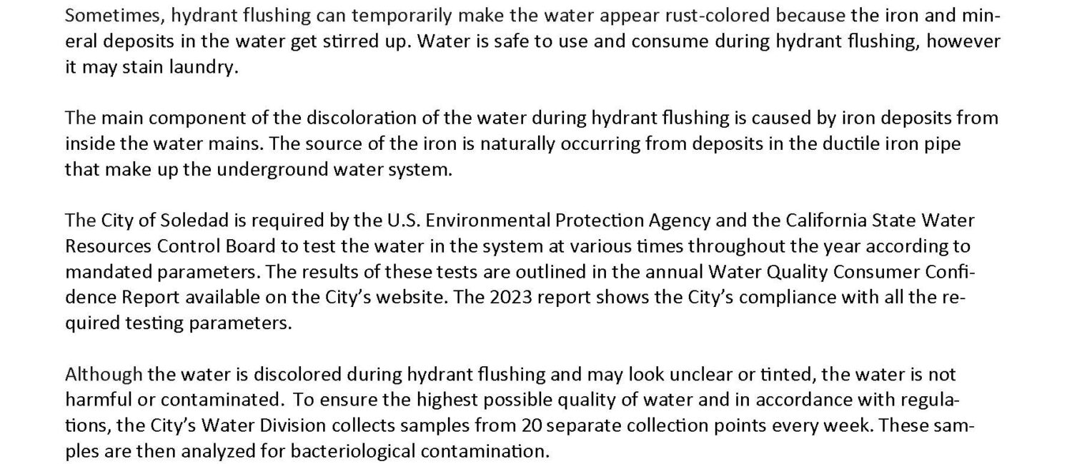 Hydrant flushing is the quick release of water from fire hydrants. It’s a controlled procedure vital to the general maintenance of the City’s water distribution system. It ensures adequate water flow is available to firefighters, residents, and businesses. It also helps maintain Soledad’s water clarity and quality by clearing iron and mineral deposits from the water mains (distribution pipes).