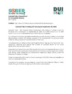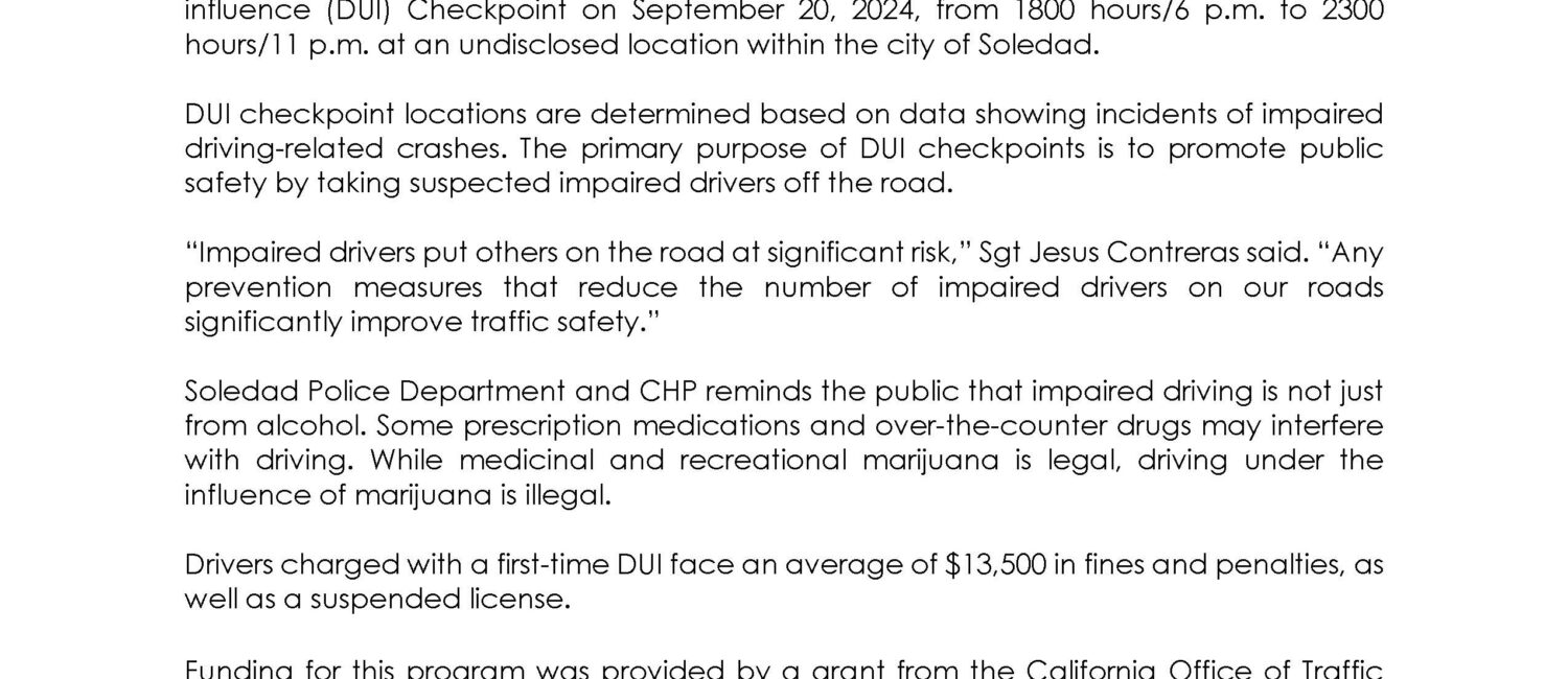 Soledad, Calif. – The Soledad Police Department will conduct a driving under the influence (DUI) Checkpoint on September 20, 2024, from 1800 hours/6 p.m. to 2300 hours/11 p.m. at an undisclosed location within the city of Soledad.