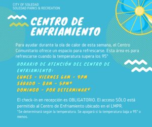 Due to the heat warning, the City of Soledad has opened its Cooling Center. Remember to stay cool, stay inside, and drink plenty of water.