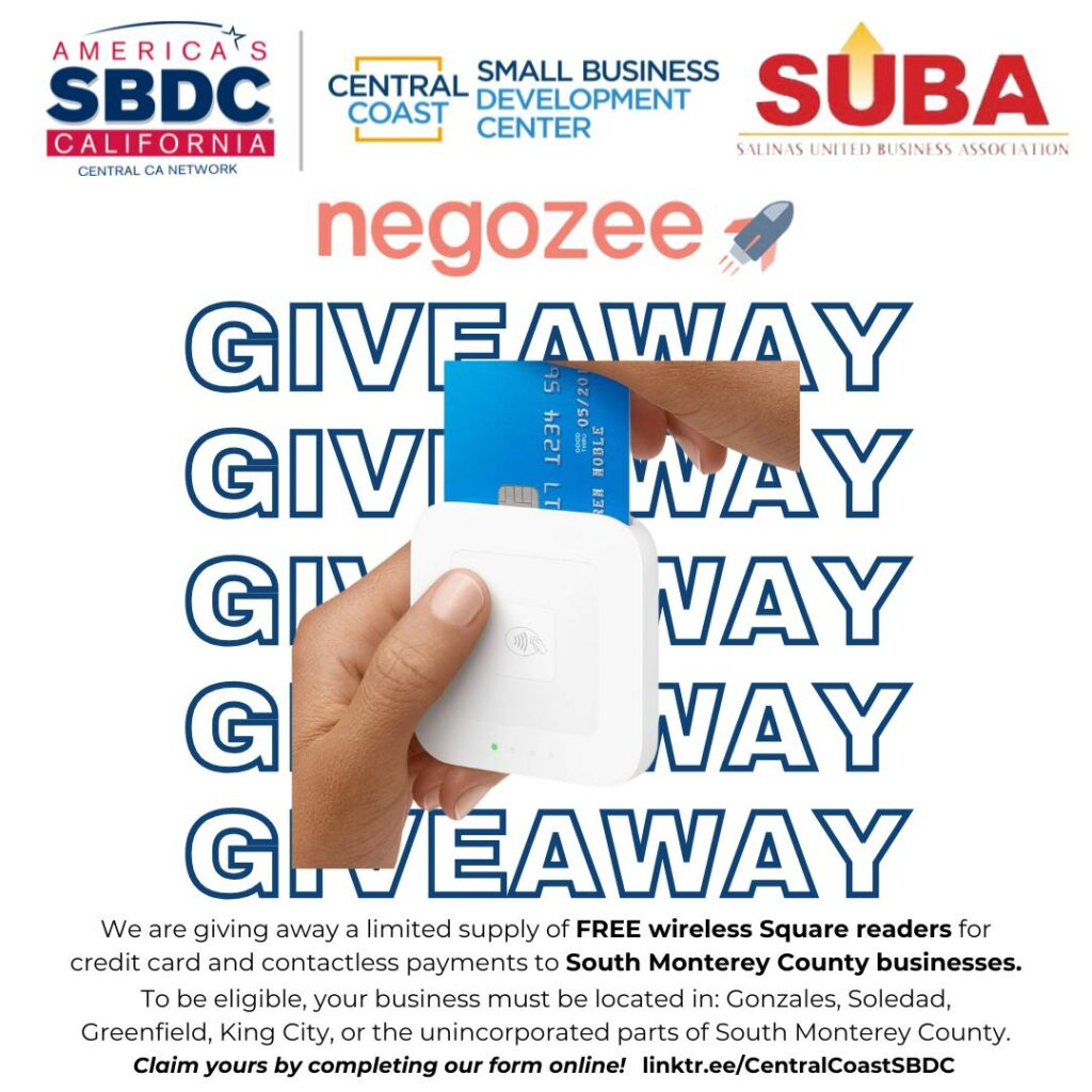 ¡Gracias a una generosa donación de @negozee_ , nuestro programa @centralcoastsbdc asociado con @subasalinas para proporcionar lectores @square inalámbricos GRATUITOS para pagos con tarjeta de crédito y sin contacto!