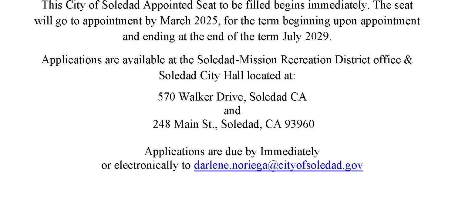 Notice of Vacancy – Soledad Mission Recreation District Board of Directors