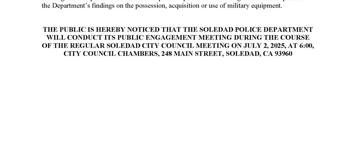 THE PUBLIC IS HEREBY NOTICED THAT THE SOLEDAD POLICE DEPARTMENT