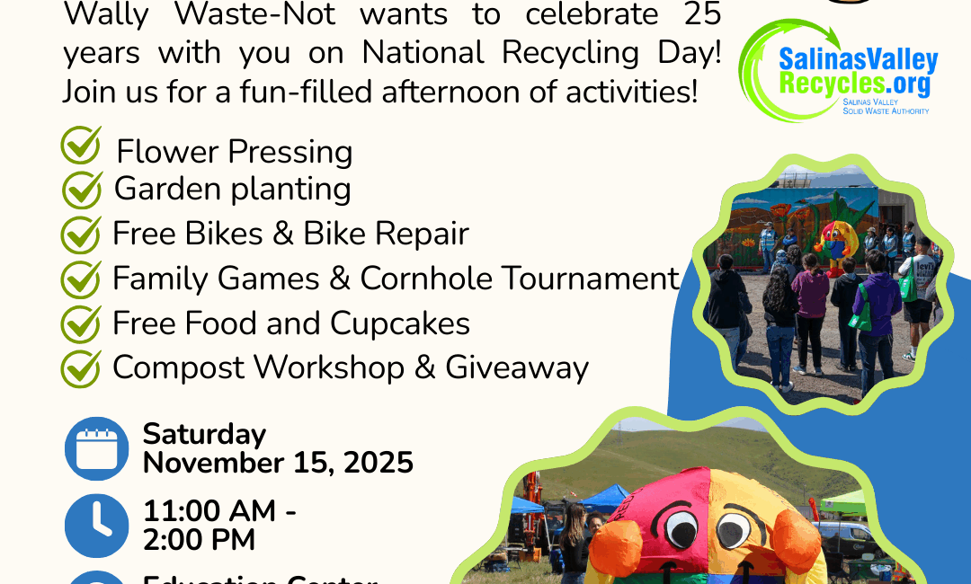 Join Salinas Valley Recycles for an afternoon of fun, food, and activities as we celebrate America Recycles Day and Wally Waste-Not’s 25th birthday!