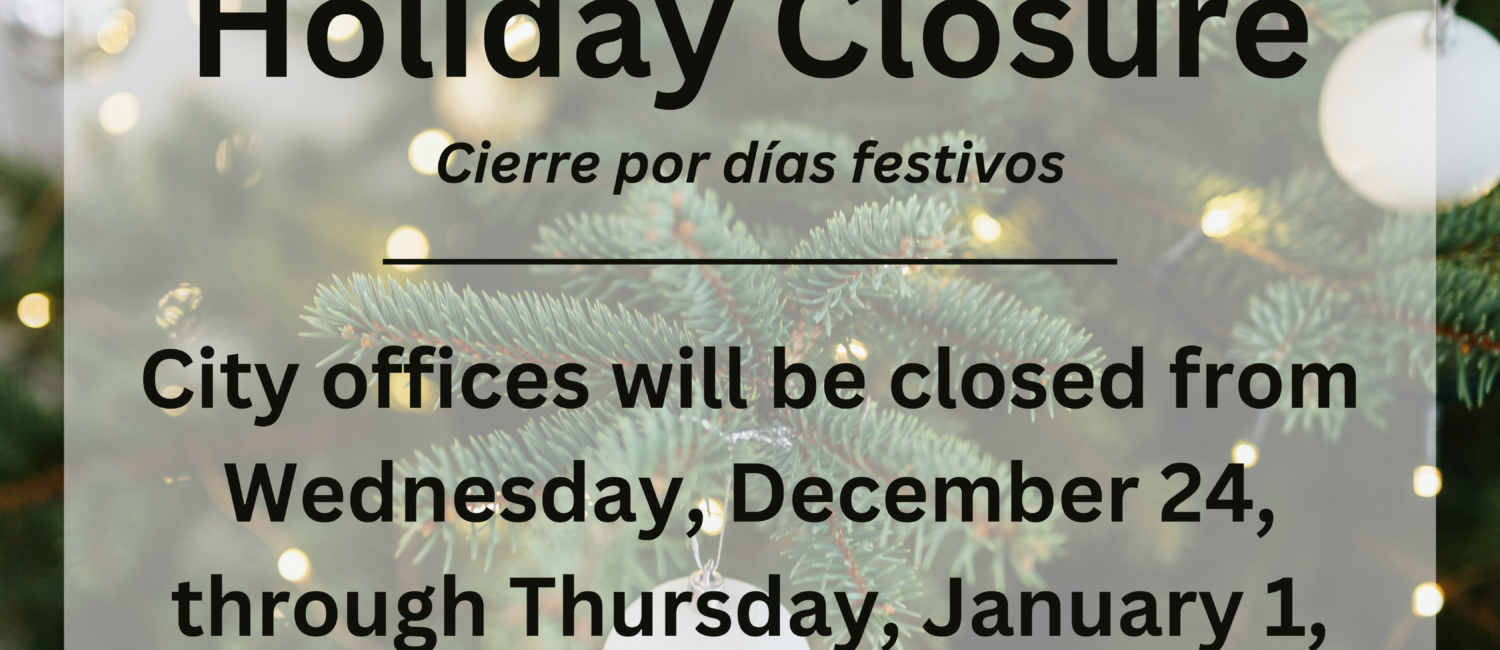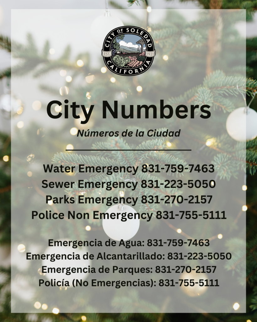City of Soledad offices will be closed from December 24 through January 1st. City offices will resume normal business hours on Friday, January 2, 2026.