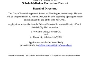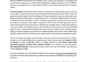 CITY OF SOLEDAD PUBLIC NOTICE Notice of Public Meeting for Discussion of State Community Development Block... Read More → CITY OF SOLEDAD – PUBLIC NOTICE –