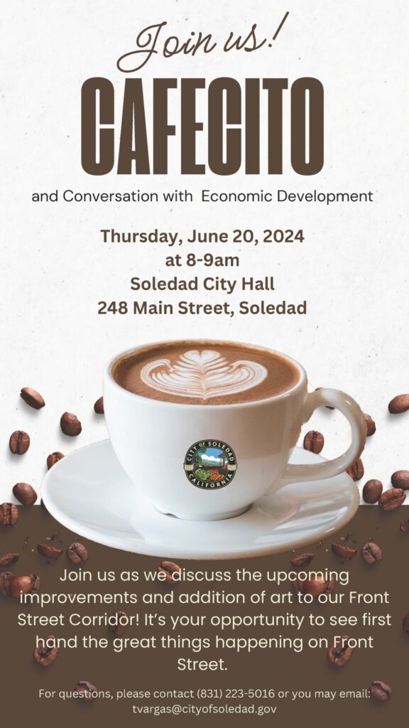 Join us for Cafecito and Conversation with Economic Development every last Thursday of the month at the Council Chambers located within Soledad City Hall.
