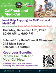 The City of Soledad, in partnership with Catholic Charities Diocese of Monterey, will be hosting a FREE event on Thursday, December 18, from 10:00 a.m. to 6:00 p.m. at Soledad City Hall to assist residents with Medi-Cal and CalFresh enrollment.