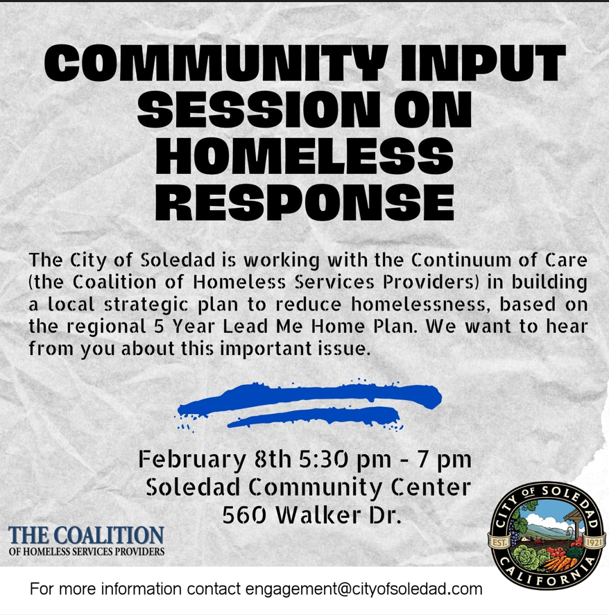 The city of Soledad is working with Continuum of Care (the Coalition of Homeless Services Providers) in building a local strategic plan to reduce homelessness, based on the regional 5 Year Lead me Home Plan. we want to hear from you about this important issue.