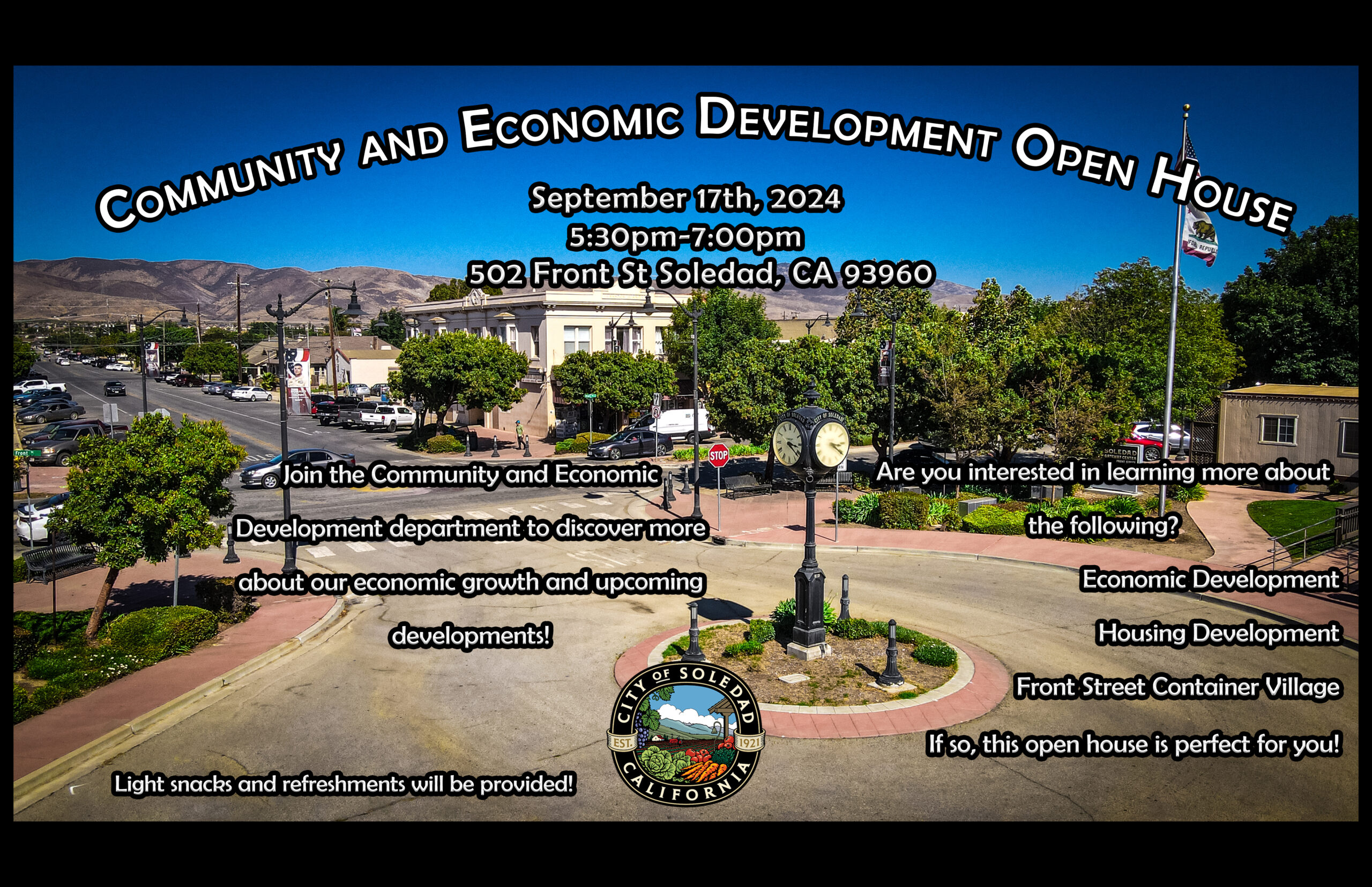 Narrative: Have you ever wondered how economic growth unfolds or how housing developments take shape in the City of Soledad? The answer lies with the Community and Economic Development Department, which ensures that our community continues to grow. On September 17th, from 5:30 to 7:00 PM, the department will host an Open House at the Soledad Gateway Center, located at 502 Front Street, Soledad, CA 93960. We invite you to join us, enjoy some light refreshments, and discover more about what’s happening in Soledad!
