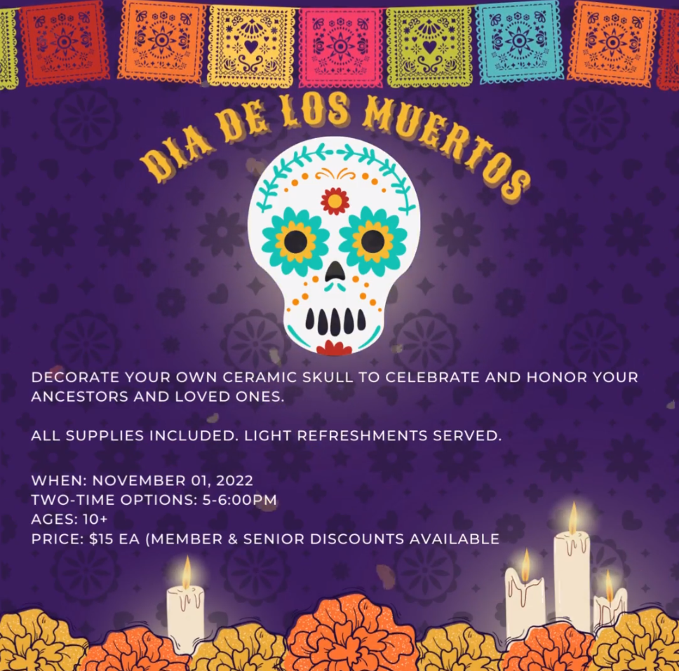 Celebrate Día De Los Muertos by decorating your own skull ceramic bank. Using acrylic pens, you will achieve high detail to create something beautiful for your altar or decor.