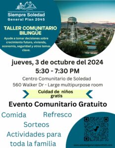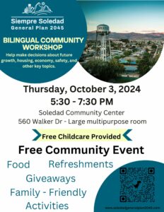 Narrative: Complimentary childcare and food will be available! During this workshop, you’ll have the opportunity to share your thoughts on what you’d like to see in your city. Should Soledad focus on building more single-family homes or townhouses? Would you prefer more commercial centers? Are additional biking lanes important to you? Your feedback is essential in shaping the future! Don’t forget, this event is free, and childcare is provided! All participants will be entered into a raffle!