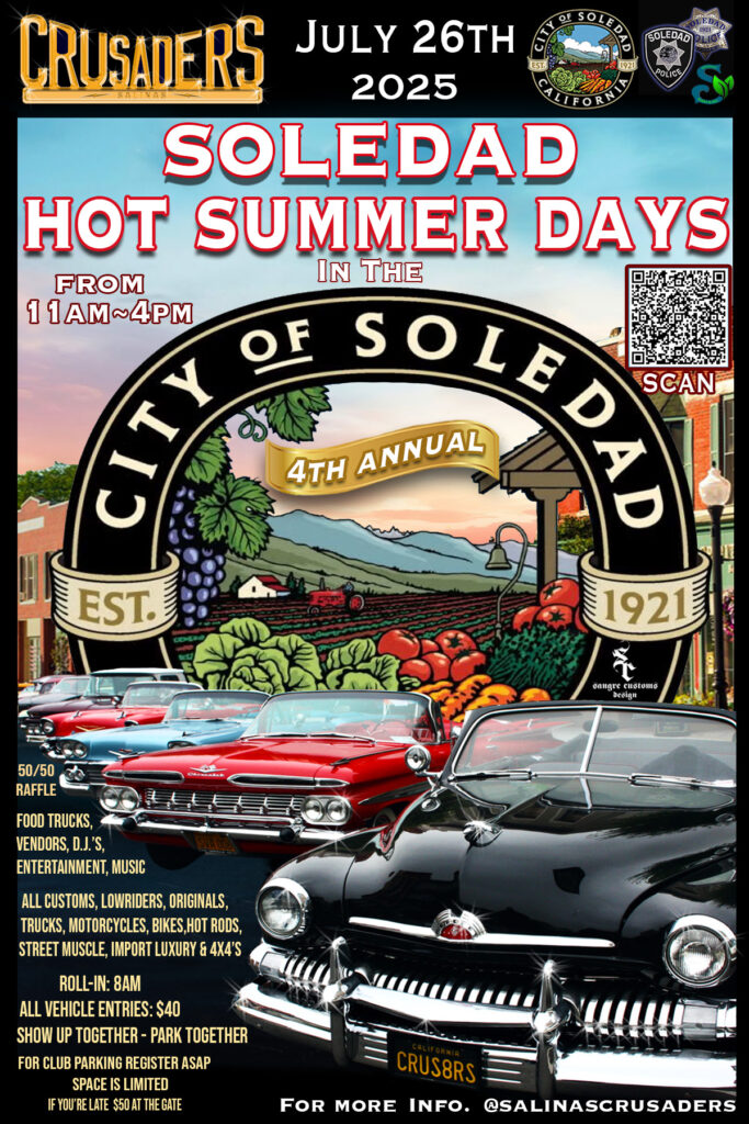 Join us July, 26th in downtown Soledad for our annual Hot Summer Days Car Show! Live entertainment, food vendors and so much more!