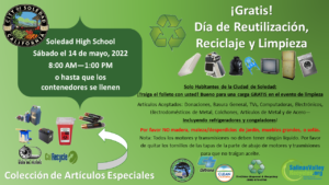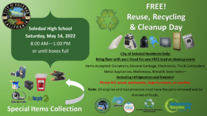 Soledad Residents, there will be a Reuse, Recycling & Cleanup Day on Saturday, May 14 from 8:00 a.m. – 1:00 p.m. at Soledad High School. This will be available to Soledad residents only. Thank you!