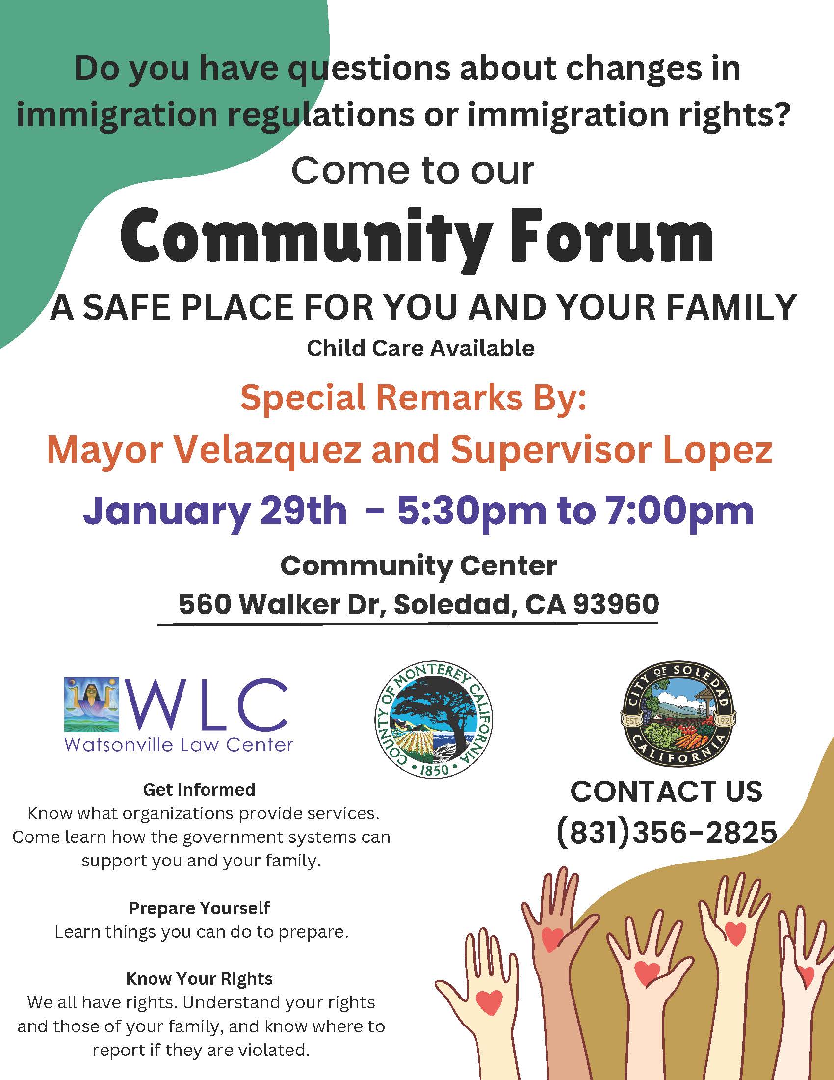 The City of Soledad, along with the Watsonville Law Center and Supervisor Chris Lopez will be hosting a Know Your Right on Immigration workshop on Wednesday, January 29 at 5:30 pm at the Community Center.