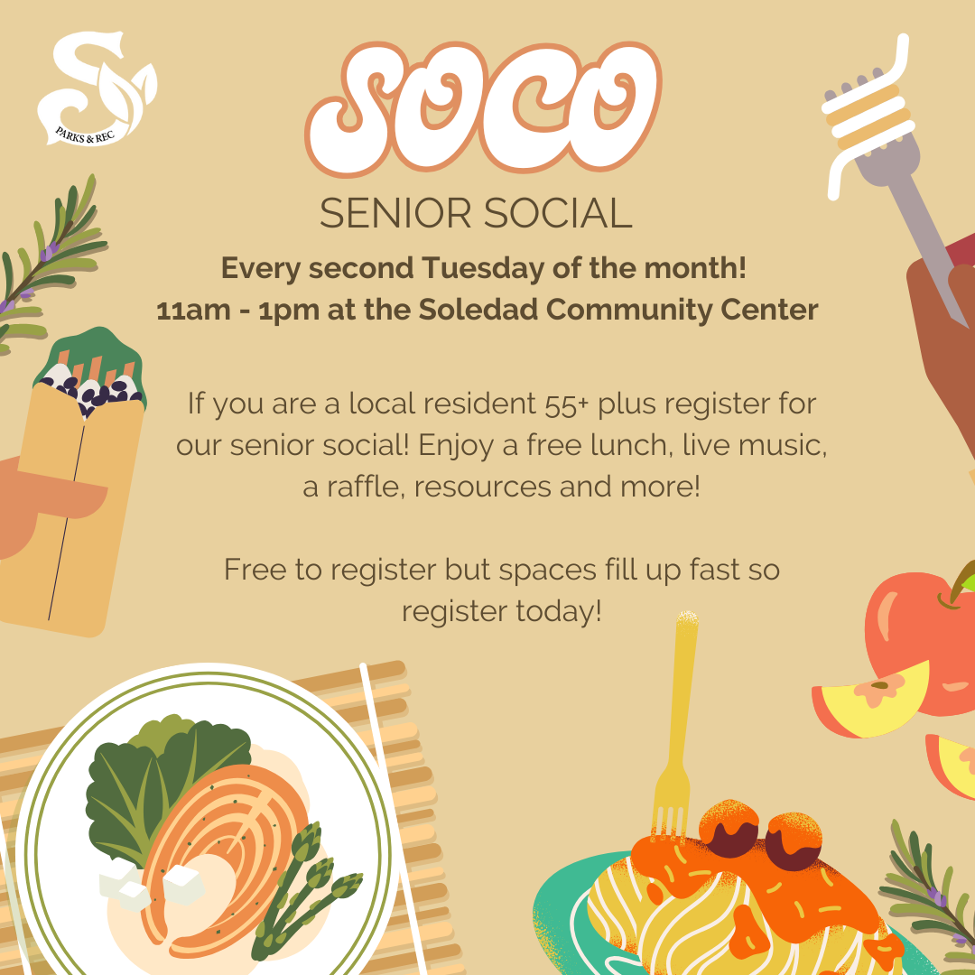 If you are a local resident 55+ plus register for our senior social! Enjoy a free lunch, live music, a raffle, resources and more! Free to register but spaces fill up fast so register today! https://secure.rec1.com/CA/soledad-ca/catalog?filter=c2VhcmNoPTM4NzMwNzQ=